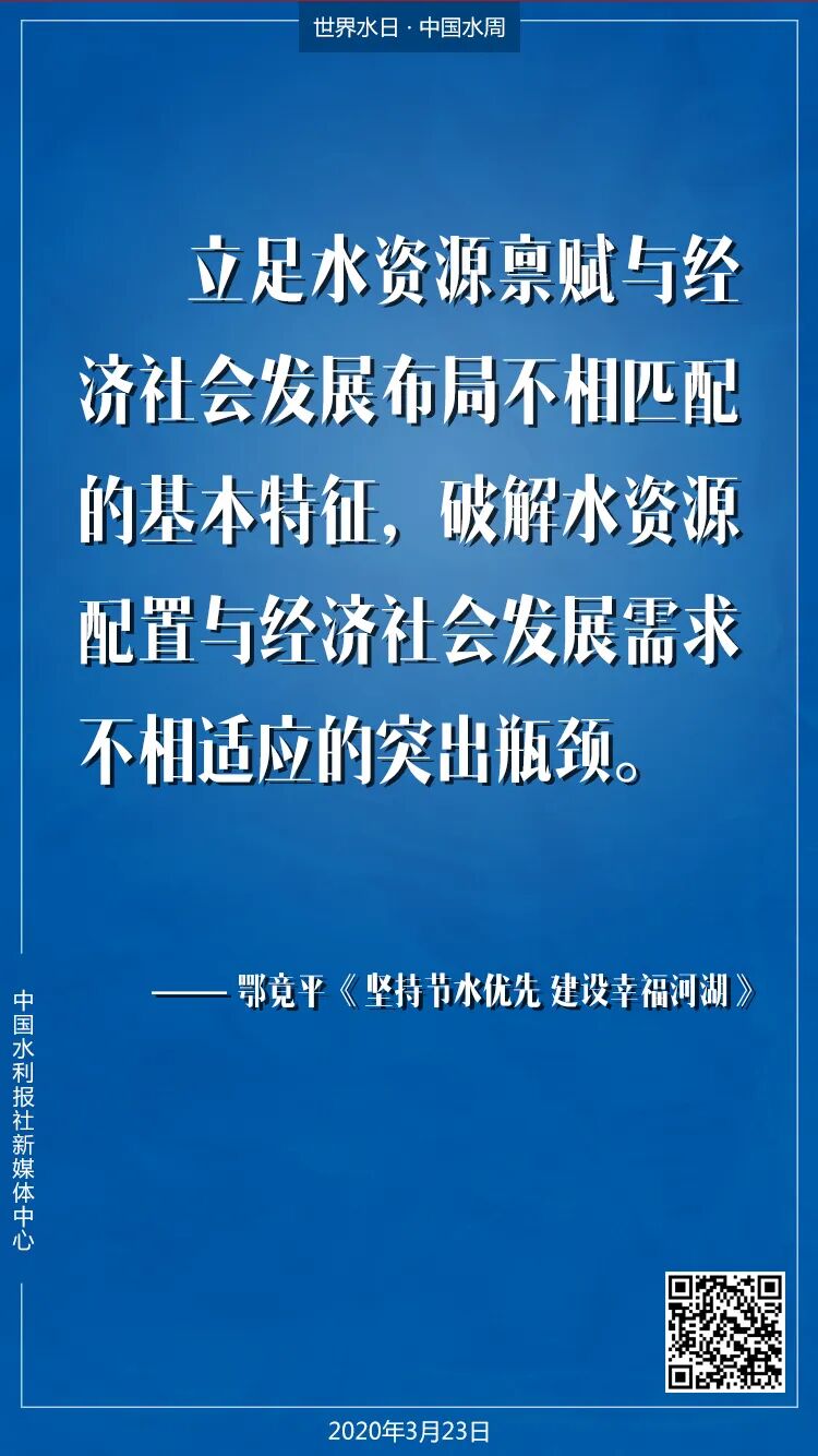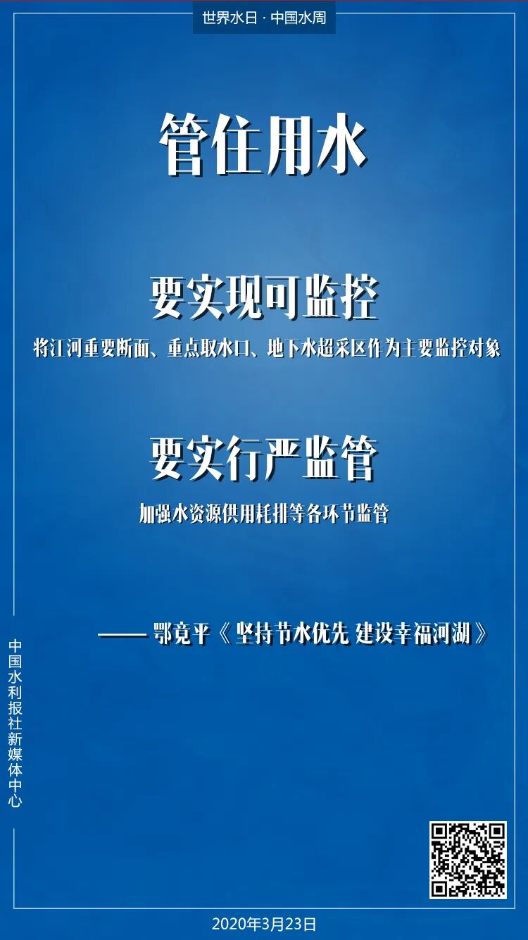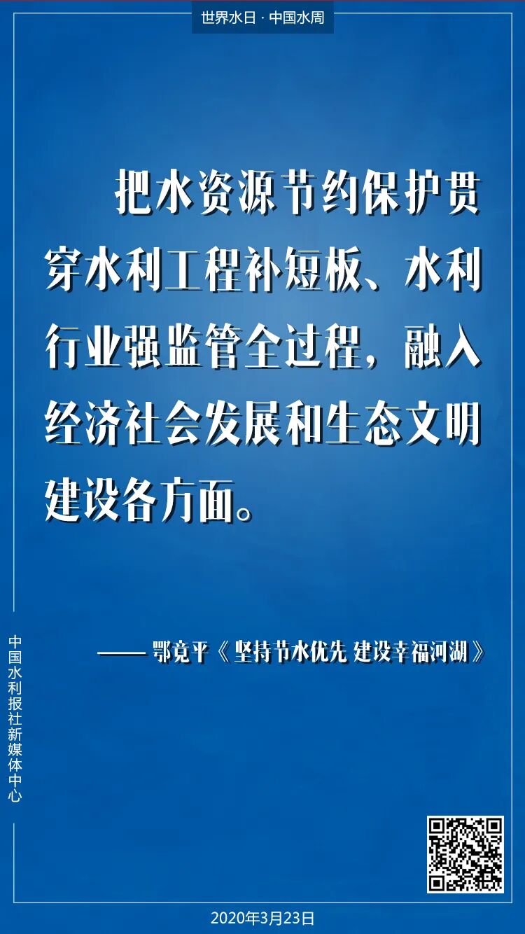 2020年“世界水日”“中国水周”来临之际,水利部党组书记、部长鄂竟平在《人民日报》发表署名文章《坚持节水优先 建设幸福河湖——写在2020年世界水日和中国水周之际》。
